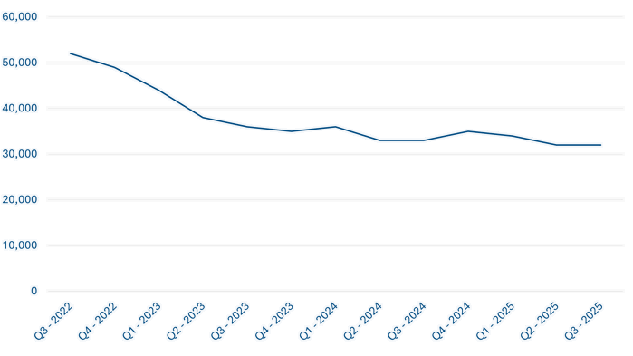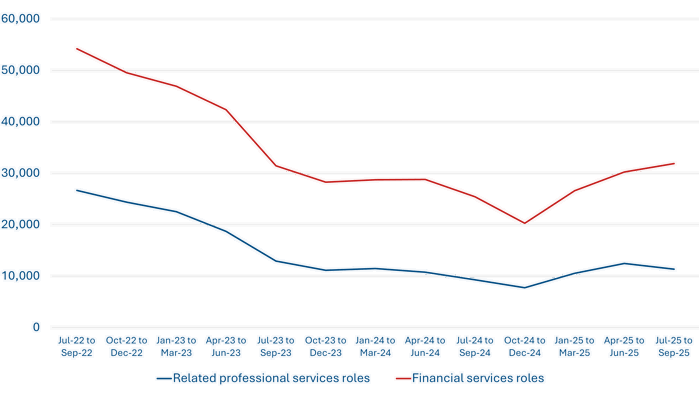In the July-September 2025 quarter there were 31,884 online job advertisements for the financial services roles, up from 25,425 a year earlier but down from a peak of 54,201 in the post-pandemic hiring boom in January-March 2022. For the two related professional services roles, online advertisements totalled 11,347 in the latest quarter, up from 9,299 a year earlier and a peak of 31,220 in January-March 2022.