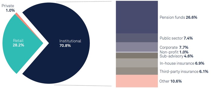 Source: TheCityUK calculation based on Thinking Ahead Institute, Investment company institute, International Association of Insurance Supervisors, McKinsey, ETFGI, BarclayHedge, Capgemini data