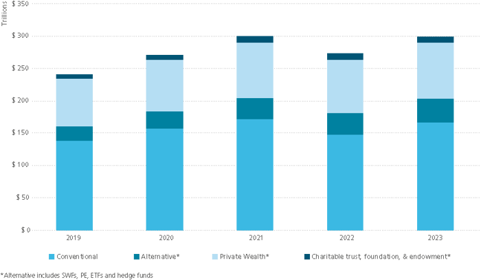 Our report sought to shine a light on the sector, which can often feel like an unsung hero within the wider financial services sector, often operating with less publicity than (for example) banking or insurance. However, asset management has been one of the best-performing sectors within financial services. Globally, we estimate assets under management (AUM) by the sector to have reached almost $3trn in 2023 – although this figure is indicative, not precise, since data and definitions are not directly comparable across sources.