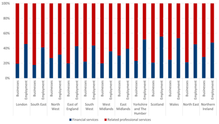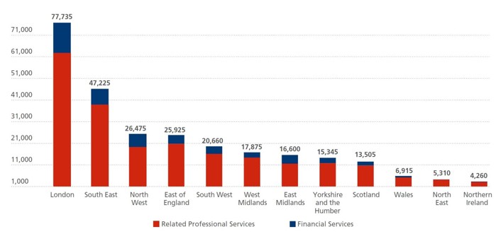 In these two regions (as well as in the East of England, North East, Scotland and the West Midlands), the split between financial services businesses and related professional services businesses was about 20%/80%. This was in line with the average across the UK, where the split was 23% financial services / 77% related professional services—so these regions showed only a very slightly higher representation of related professional services businesses compared to the UK average. In three regions and nations—the North West, East Midlands and Northern Ireland—the data skewed the other way, with approximately 30% of business in financial services and only 70% in related professional services (so, with a slight skew towards financial services businesses relative to the UK average).