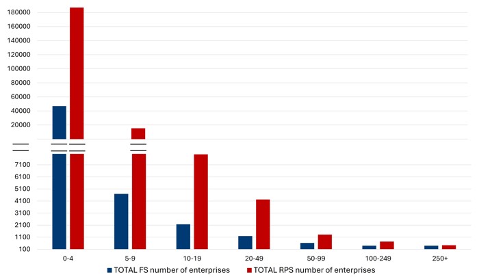 Related professional services firms are also more evenly distributed across different firm sizes. In every employee size band there are more related professional services firms than there are financial services firms. However, they are particularly over-represented among micro-organisations (0-4 employees), with four times the number of related professional services firms as financial services firms in that category:
