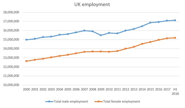 With financial inclusiveness, I referred to women working in financial services. Office for National Statistics (ONS) data reveal that in the UK overall, both male and female employment has risen fairly steadily since 2000. But in financial services, a gap between male and female employment emerged after the financial crisis and has widened since then. In fact, until 2005 more women than men worked in the industry; since 2006 the industry has employed more men than women, and in 2017 the gap between the two was more than 150,000, as you can see here: