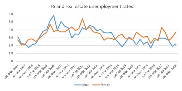 But the incidence of higher female unemployment is concentrated in 2011, plus 2014 through Q1 2018. And in that recent period, the gap has been relatively high, at 0.7 percentage points on average. For example, in Q1 2018 the male unemployment rate in finance and real estate was 2.2%, compared to the female rate of 3.7%.