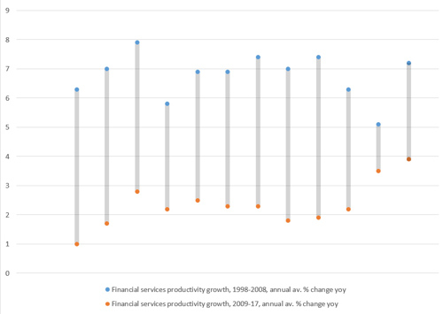 Financial services productivity growth, 2009-17, annual av. % change yoy