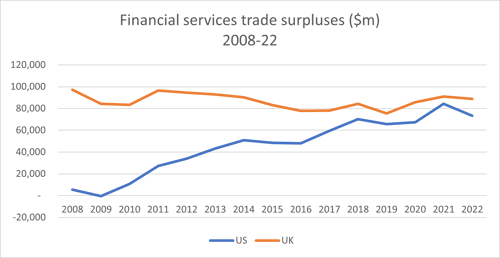The gap between the UK’s and the US’s financial services trade surplus has narrowed over time