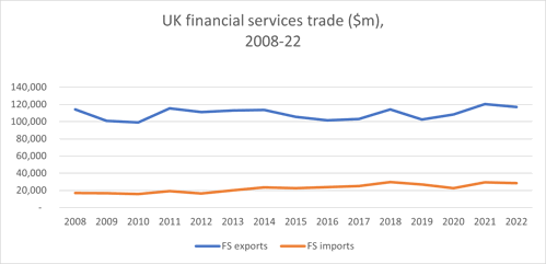 This much faster growth of exports than of imports means that the trade surplus increased significantly. In contrast, both exports and imports of UK financial services were relatively flat, explaining why the trade surplus has been maintained but not grown: