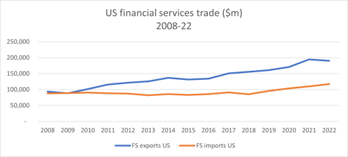 This dynamic has been driven by very strong growth of US financial services exports. US financial services imports have remained relatively steady, albeit with a noticeable uptick since 2018. US financial services exports, on the other hand, more than doubled, rising from $93bn in 2008 to $190bn in 2022: