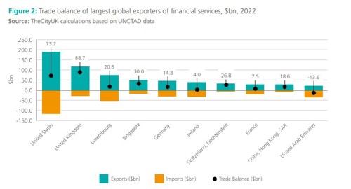 Our recently-launched ‘Key Facts about the UK as an international financial centre’ report found that the UK continues to record the world’s largest trade surplus in financial services. As our research makes clear, US financial services exports exceed those of the UK, but when the net position (exports minus imports) is considered, the UK leads because its financial services imports are considerably less than those of the US.
