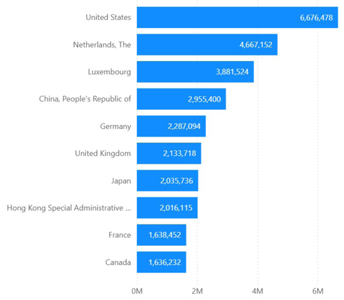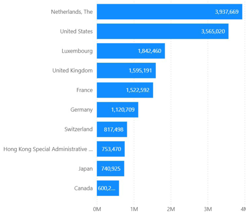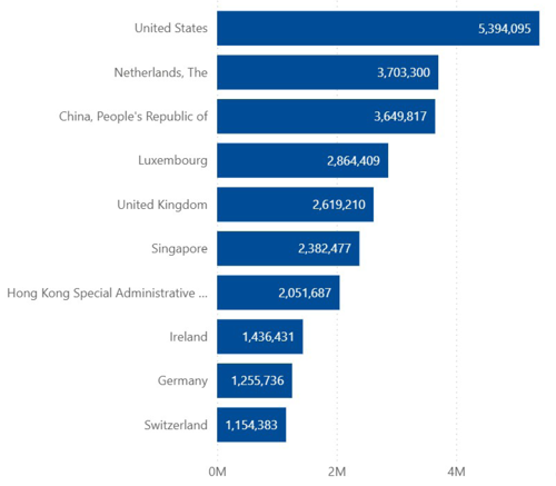 The most noticeable change is the weight of Emerging Markets (represented in the charts above in green) in global FDI. In 2009, Emerging Markets were the source of only 2% of the global stock of FDI; by 2023 this had increased to 6%. This was because of a 10-fold increase in dollar terms, from $22bn in 2009 to $225bn in 2023.