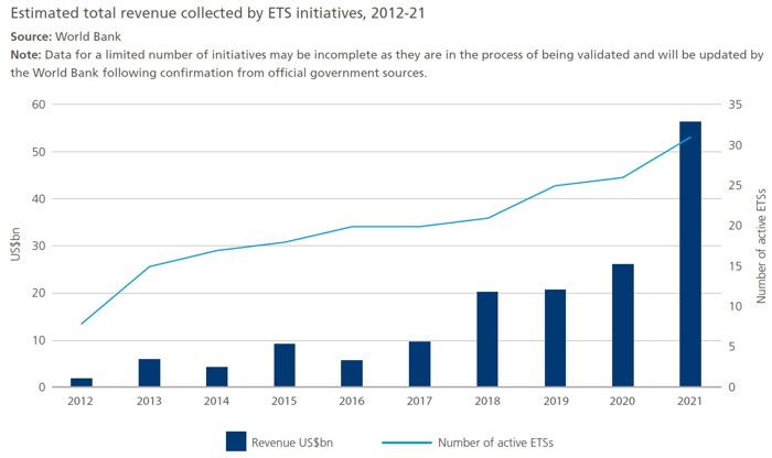 Growth in the number of ETSs implemented over time; as well as an increase in ETS prices (and the increasing share of auctioned allowances rather than free allocations) both contributed to this revenue growth.