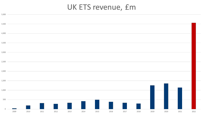 In the UK, ETS revenue rose dramatically in 2022, in tandem with the transition from the EU ETS to the new UK ETS. The UK ETS was implemented in January 2021 in the wake of Brexit, with the first payments available from 2022. ETS revenue in 2022 totalled £4.6bn, four times more than the £1.1bn garnered in 2021. Of this £4.6bn, 95% was from the UK ETS and 5% was from the EU ETS.