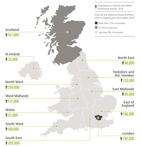 I was very pleased to launch our 2018 ‘Enabling growth across the UK report’ in Leeds earlier this month. The latest edition of our annual report quantifying the contribution of financial and related professional services to employment and GVA in each of the UK’s regions and nations observes, among other things, that between 2015 and 2016, the North West saw the largest rise in percentage terms in industry employment. The industry’s spread across the UK is summarised in this image: